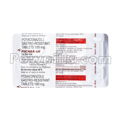 Picasa GR is a Skin Care drug prescribed for the treatment of fungal infections. Containing Posaconazole, this drug is mainly prescribed for the treatment of aspergillosis and candidiasis, two types of fungi often visible in patients with low immune systems. It is a very effective medicine that works on candidiasis in only 13 weeks when a proper dose is taken and cures critical fungal infections like aspergillosis in only 6-7 weeks (although it can take a longer time if heavily infected).